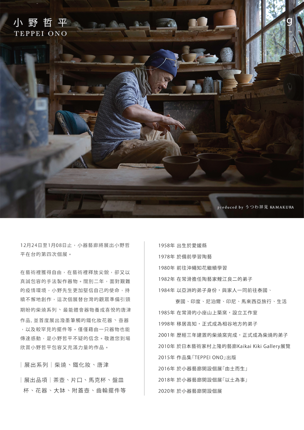 12月24日至1月08日小器藝廊將展出小野哲平在台的第四次個展。