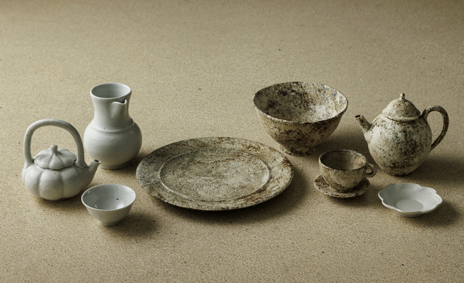 ふくよかで優美な白磁や白釉、味わい深い織部や粉引など、健やかで親しみに満ちたおふたりの世界をご覧いただけます。