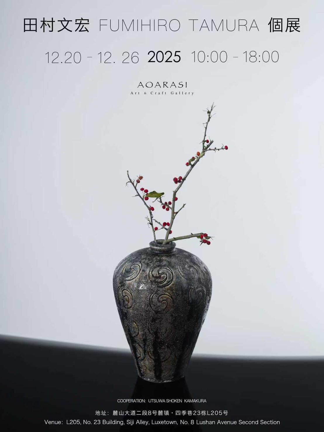 中国・四川省の首都成都のAOARASI Craft Galleryにて、田村文宏展が開催されます。